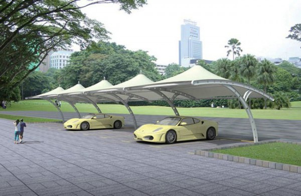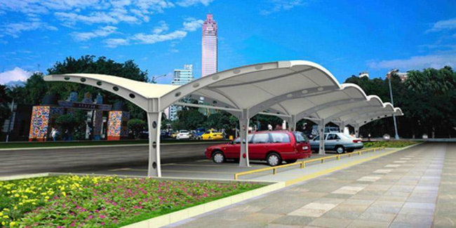 膜結(jié)構(gòu)停車棚以一種類似帳篷、充滿柔性的建筑越來越多地出現(xiàn)在城市廣場(chǎng)、公園邊上,以其優(yōu)美的曲線吸引了大眾的目光,其造型自由輕巧、阻燃、制作簡(jiǎn)易、安裝便捷、節(jié)能、易于使用。作為一種特殊的現(xiàn)代建筑結(jié)構(gòu),以高強(qiáng)度柔韌性薄膜材料與張拉體系相結(jié)合,形成的具有一定剛度的空間結(jié)構(gòu)體。
